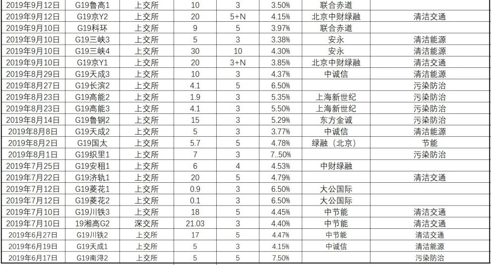 | 2019/6/17 | G19南浔2 | 上交所 | 15 | 5 | 7.50% | -- | 污染防治 |